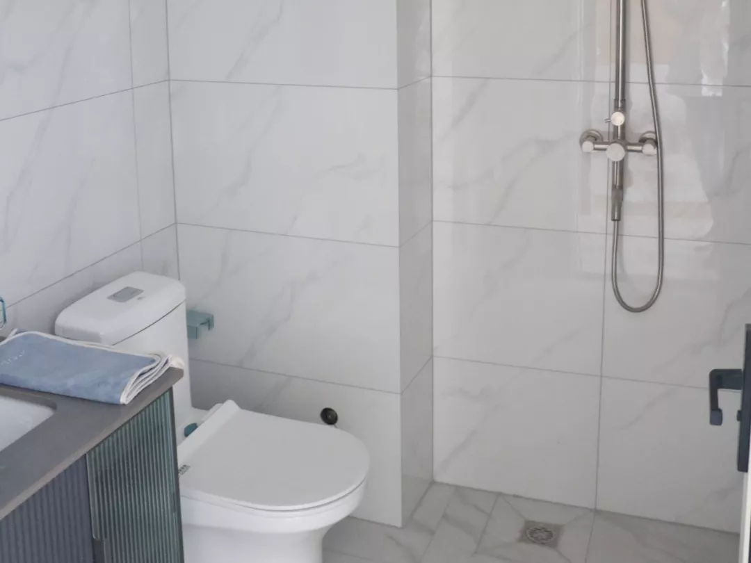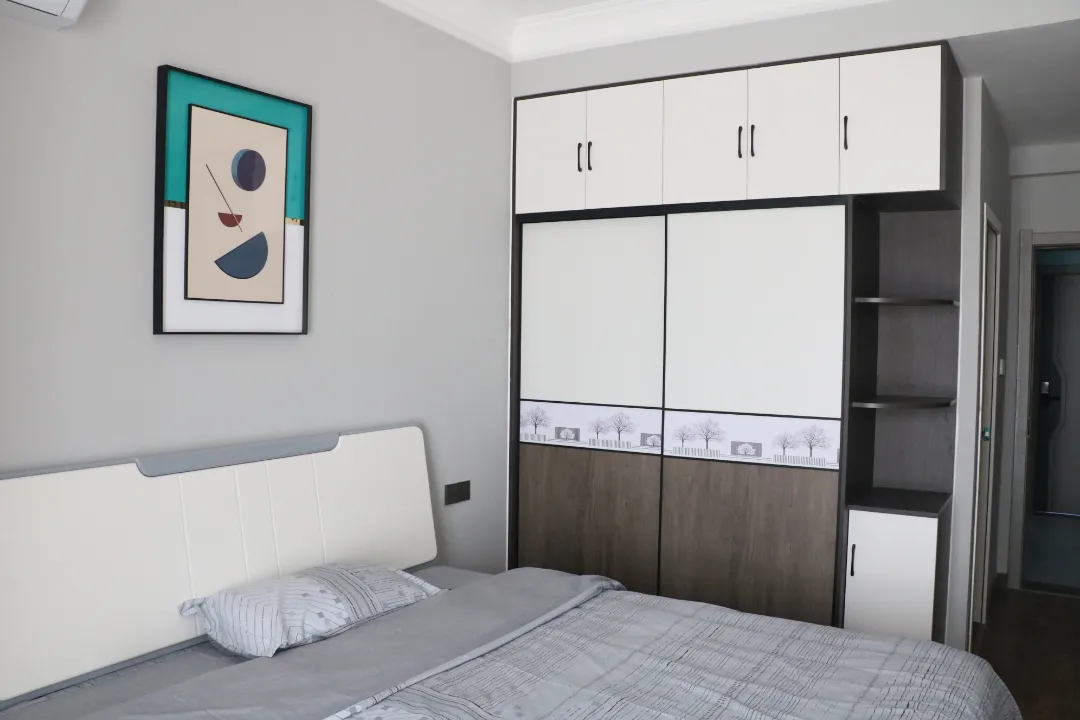 推开门后,光线从飘窗照进屋内,十分明亮。舒适简洁的空间,崭新的床、衣柜等家具整齐地摆放着,电视、空调等家电也一应俱全,可实现“拎包入住”。